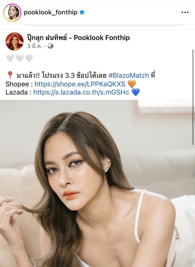 ขยับมาที่ นักแสดงสาว “ปุ๊กลุก ฝนทิพย์” ที่ออกมาชี้แจงหลังมีมิจฉาชีพสร้างเพจปลอม โดยใช้ชื่อและรูปของเธอ “เพจนี้ ไม่ใช่เพจของปุ๊กลุกนะคะ ทำคนเข้าใจผิดคิดว่าเป็นเพจของปุ๊กลุกมาตลอดเพราะเอารูปปุ๊กลุกไปลงใช้แคปชั่นต่าง ๆ เหมือนเป็นปุ๊กลุกเอง พยายามติดต่อเจ้าของเพจ ในหลาย ๆ ช่องทางมาตลอดหลายปี แต่ก็ไม่มีการตอบกลับ แจ้ง Facebook ไปแต่ก็ไม่มีการระงับใด ๆ เอารูปของปุ๊กลุกไปขายของไปขายสินค้าแบบนี้ไม่น่ารักเลยค่ะ