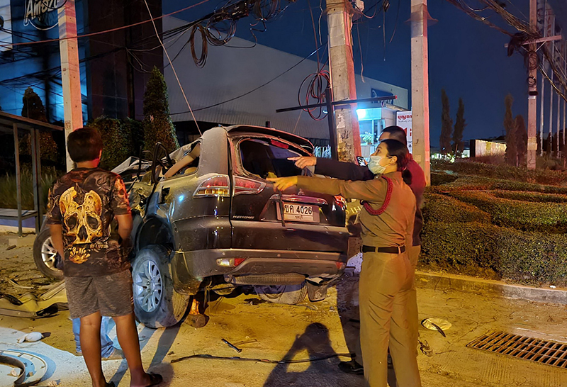 ปาเจโร่เสียหลักตกไหล่ถนนชนเสาไฟหัก2ท่อน บนถนนสุขุมวิททางเข้าโรงไฟฟ้าย่อยบางเสร่ คนขับเจ็บ