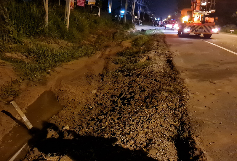 ที่เกิดเหตุ พบรถยนต์ยี่ห้อมิตซูมิชิ ปาเจโร่ หมายเลขทะเบียน ขค 4026 ชลบุรี สีดำ ชนอัดกับเสาไฟส่องสว่างไหล่ถนน สภาพรถพังเสียหาย และเสาไฟได้รับความเสียหาย ใกล้กันพบผู้ได้รับบาดเจ็บเป็นชาย 1ราย ได้รับบาดเจ็บศีรษะแตก มีแผลฉีกขาดที่หลัง ถลอกตามร่างกาย อยู่ในอาการมึนงง กู้ภัยทำการช่วยทำการปฐมพยาบาลเบื้องต้น ก่อนเคลื่อนย้ายส่งรักษายังโรงพยาบาลสมเด็จพระนางเจ้าสิริกิต กรมแพทย์ทหารเรือ