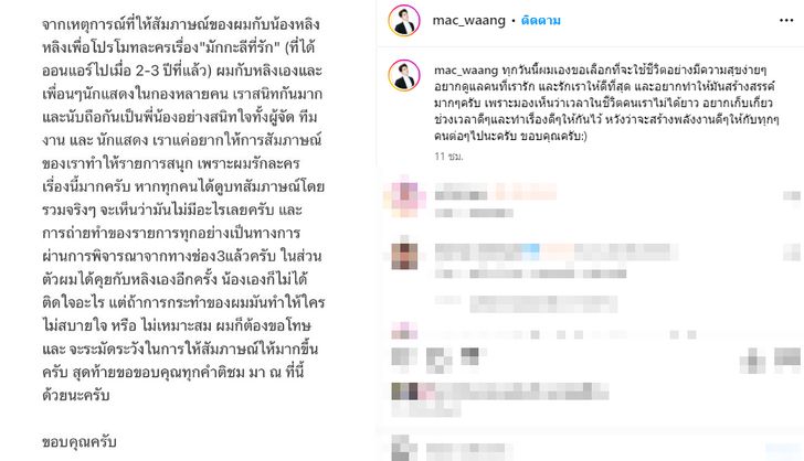 “จากเหตุการณ์ที่ให้สัมภาษณ์ของผมกับน้องหลิงหลิงเพื่อโปรโมตละครเรื่อง “มักกะลีที่รัก” (ที่ได้ออนแอร์ไปเมื่อ 2-3 ปีที่แล้ว) ผมกับหลิงเองและเพื่อนๆ นักแสดงในกองหลายคน เราสนิทกันมากและนับถือกันเป็นพี่น้องอย่างสนิทใจทั้งผู้จัด ทีมงาน และนักแสดง เราแค่อยากให้การสัมภาษณ์ของเราทำให้รายการสนุก เพราะผมรักละครเรื่องนี้มากครับหากทุกคนได้ดูบทสัมภาษณ์โดยรวมจริงๆ จะเห็นว่ามันไม่มีอะไรเลยครับ และการถ่ายทำของรายการทุกอย่างเป็นทางการผ่านการพิจารณาจากทางช่อง 3 แล้วครับ