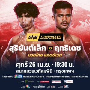 การโคจรมาพบกันระหว่าง “สุริยันต์เล็ก” และ “ฤทธิเดช” ในครั้งนี้ ไม่ต้องสงสัยเลยว่าโอกาสที่เกมจะจบแบบไม่ครบยกมีสูงมาก เนื่องจากต่างฝ่ายต่างขึ้นชื่อเรื่องการเปิดหน้าแลกแบบไม่กลัวใคร สุดท้ายฝ่ายใดจะเป็นสามารถคว้าชัยแบบเบ็ดเสร็จเด็ดขาดสมฐานะจอมน็อกประจำรายการ แฟนมวยทั่วประเทศเตรียมรับความมันขั้นสุดไปพร้อมกัน ในศึก ONE ลุมพินี 60 วันศุกร์ที่ 26 เม.ย.นี้