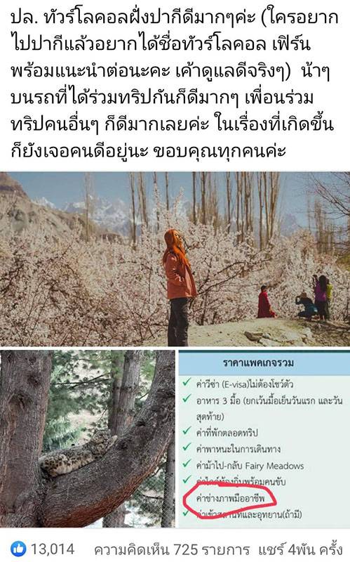 ปล. ทัวร์โลคอลฝั่งปากีดีมากๆค่ะ (ใครอยากไปปากีแล้วอยากได้ชื่อทัวร์โลคอล เฟิร์นพร้อมแนะนำต่อนะคะ เค้าดูแลดีจริงๆ) น้าๆบนรถที่ได้ร่วมทริปกันก็ดีมากๆ เพื่อนร่วมทริปคนอื่นๆ ก็ดีมากเลยค่ะ ในเรื่องที่เกิดขึ้นก็ยังเจอคนดีอยู่นะขอบคุณทุกคนค่ะ”