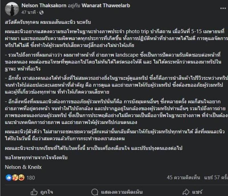 ผมและนิวอยากแสดงความขอโทษในฐานะช่างภาพประจำ photo trip ปากีสถาน เมื่อวันที่ 5-15 เมษายนที่ผ่านมาและขอยอมรับความผิดพลาดทุกประการที่เกิดขึ้น ทั้งการปฏิบัติหน้าที่ช่างภาพได้ไม่ดี การดูแลจัดการทริปได้ไม่ดี ซึ่งทำให้ผู้ร่วมทริปเสียความรู้สึกอย่างไม่น่าให้อภัย