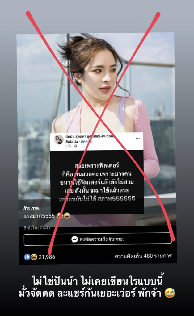 เรียกว่ารีบออกมาชี้แจงด่วน สำหรับนักแสดงสาว “ปันปัน สุทัตตา” หลังมีเพจคำคมได้นำรูปของเจ้าตัวไปใส่ในคำคมที่เขียนว่า “สวยเพราะฟิลเตอร์ ก็คือคนสวยค่ะ เพราะบางคนขนาดใช้ฟิลเตอร์แล้วยังไม่สวยเลย ดังนั้นจะมาใช้แล้วสวยเหมือนกันไม่ได้ สภาพ 5555” ซึ่งรูปภาพดังกล่าวถูกแพร่กระจายเต็มโลกออนไลน์