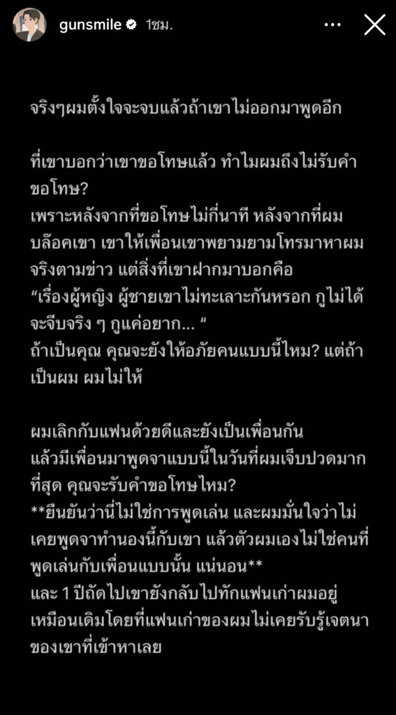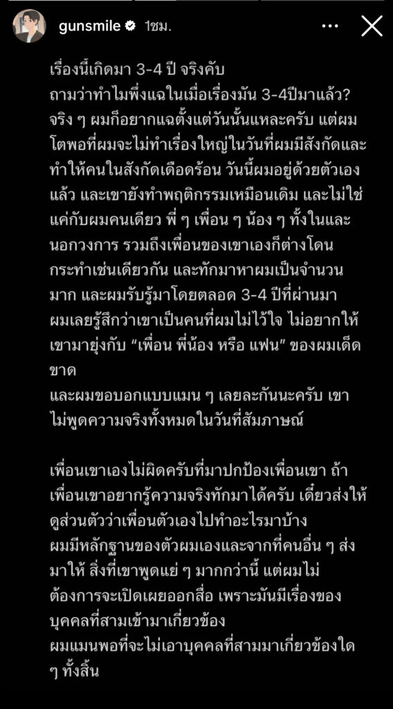 เรื่องนี้เกิดมา 3-4 ปี จริงคับ ถามว่าทำไมพึ่งแฉในเมื่อเรื่องมัน 3-4ปีมาแล้ว? จริง ๆ ผมก็อยากแฉตั้งแต่วันนั้นแหละครับ แต่ผมโตพอที่ผมจะไม่ทำเรื่องใหญ่ในวันที่ผมมีสังกัดและทำให้คนในสังกัดเดือดร้อน วันนี้ผมอยู่ด้วยตัวเองแล้ว และเขายังทำพฤติกรรมเหมือนเดิม และไม่ใช่แค่กับผมคนเดียว พี่ ๆ เพื่อน ๆ น้อง ๆ ทั้งในและนอกวงการ รวมถึงเพื่อนของเขาเองก็ต่างโดนกระทำเช่นเดียวกัน และทักมาหาผมเป็นจำนวนมาก และผมรับรู้มาโดยตลอด 3-4 ปีที่ผ่านมาผมเลยรู้สึกว่าเขาเป็นคนที่ผมไม่ไว้ใจ ไม่อยากให้เขามายุ่งกับ “เพื่อน พี่น้อง หรือ แฟน” ของผมเด็ด