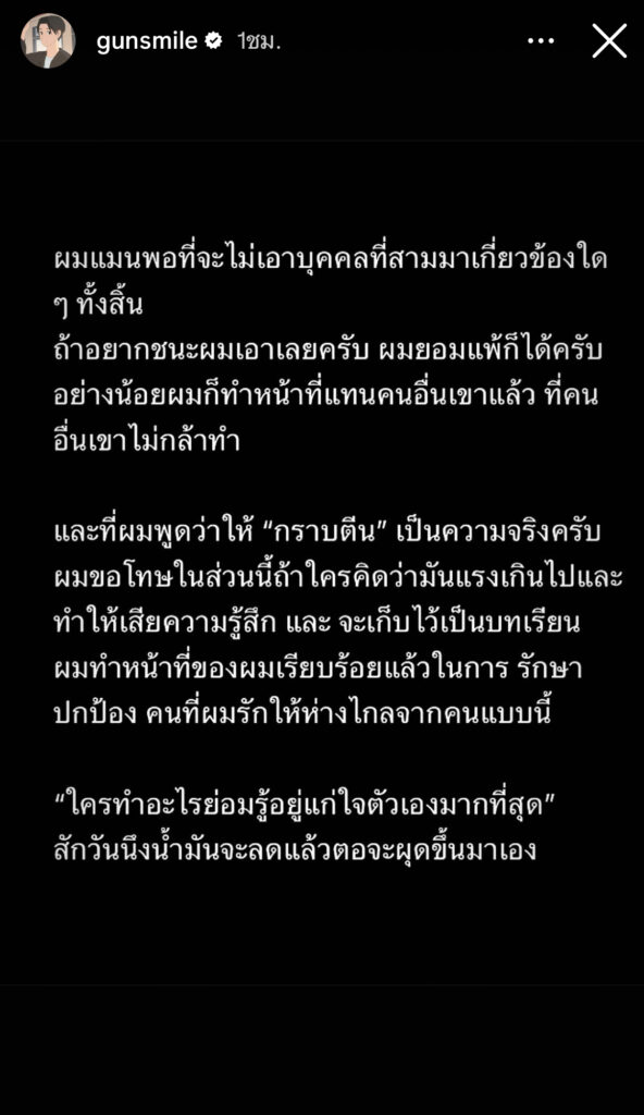 ผมแมนพอที่จะไม่เอาบุคคลที่สามมาเกี่ยวข้องใดถ้าอยากชนะผมเอาเลยครับ ผมยอมแพ้ก็ได้ครับ อย่างน้อยผมก็ทำหน้าที่แทนคนอื่นเขาแล้ว ที่คน และที่ผมพูดว่าให้ “กราบตีน” เป็นความจริงครับผมขอโทษในส่วนนี้ถ้าใครคิดว่ามันแรงเกินไปและทำให้เสียความรู้สึก และ จะเก็บไว้เป็นบทเรียนผมทำหน้าที่ของผมเรียบร้อยแล้วในการ รักษาปกป้อง คนที่ผมรักให้ห่างไกลจากคนแบบนี้