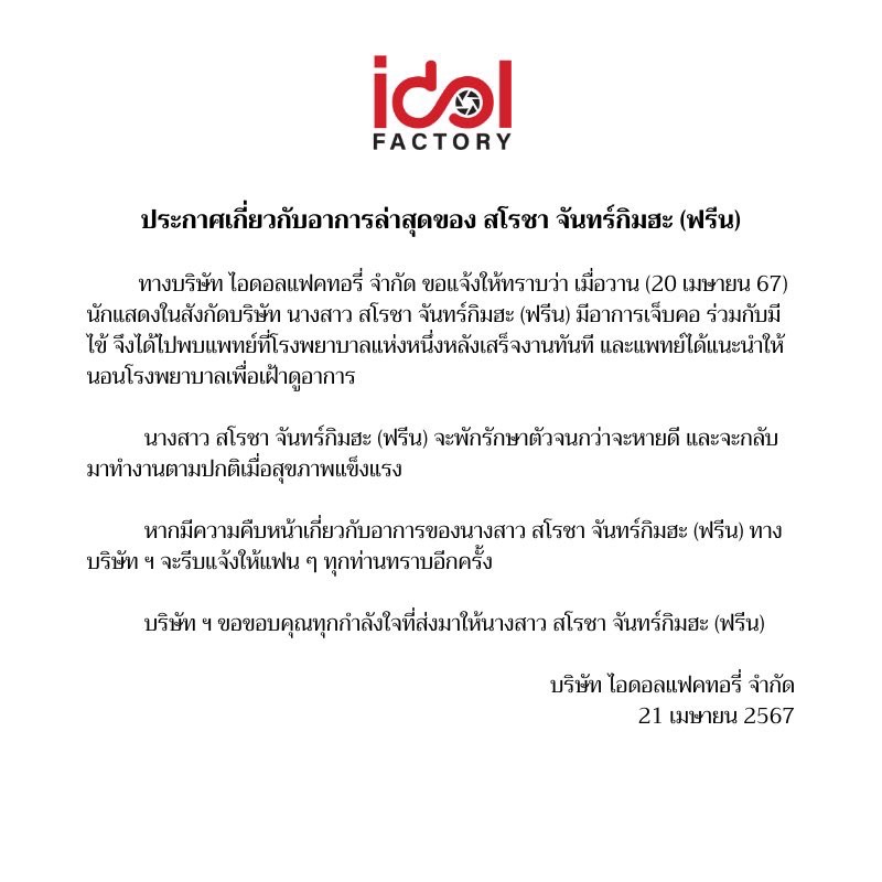 ทำเอาแฟนคลับแห่เป็นห่วง และส่งกำลังใจให้นักแสดงมากความสามารถ “ฟรีน สโรชา” กันเต็มโลกออนไลน์ หลังจากที่ทางต้นสังกัด ได้ออกมาประกาศว่า ”ทางบริษัท ไอดอลแฟคทอรี่ จำกัด ขอแจ้งให้ทราบว่า เมื่อวาน (20 เมษายน 67) นักแสดงในสังกัดบริษัท นางสาว สโรชา จันทร์กิมฮะ (ฟรีน) มีอาการเจ็บคอ ร่วมกับมีไข้ จึงได้ไปพบแพทย์ที่โรงพยาบาลแห่งหนึ่งหลังเสร็จงานทันที และแพทย์ได้แนะนำให้นอนโรงพยาบาลเพื่อเฝ้าดูอาการ นางสาว สโรชา จันทร์กิมฮะ (ฟรีน) จะพักรักษาตัวจนกว่าจะหายดี และจะกลับมาทำงานตามปกติเมื่อสุขภาพแข็งแรง หากมีความคืบหน้าเกี่ยวกับขอาการของนางสาว สโรชา จันทร์กิมฮะ (ฟรีน) ทางบริษัท ฯ จะรีบแจ้งให้แฟนๆ ทุกท่านทราบอีกครั้ง บริษัท ฯ ขอขอบคุณทุกกำลังใจที่ส่งมาให้นางสาว สโรชา จันทร์กิมฮะ (ฟรีน)”