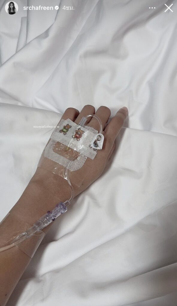 และต่อมาทาง “ฟรีน” ได้ออกมาโพสต์ไอจีสตอรี่ เป็นภาพให้น้ำเกลือ พร้อมเขียนข้อความ “ขอบคุณคับพี่พยาบาล”