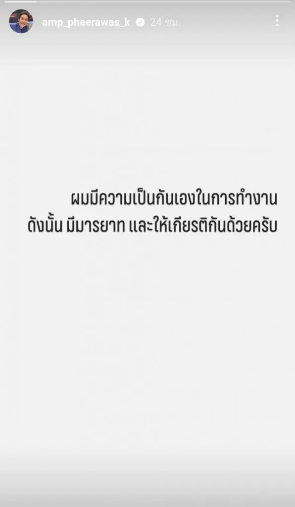 ล่าสุดทำเอาชาวเน็ตสะดุ้งเบาๆ แห่เป็นห่วงว่าเกิดอะไรขึ้นกับหนุ่ม “แอมป์” หลังเจ้าตัวออกมาโพสต์ในไอจีสตอรี่ว่า “ผมมีความเป็นกันเองในการทำงาน ดังนั้นมีมารยาท และให้เกียรติกันด้วยครับ” ซึ่งงานนี้ไม่รู้หนุ่ม “แอมป์” หมายถึงใคร หรือว่าเป็นแค่การโพสต์คำคมเฉยๆ ก็ต้องรอเจ้าตัวออกมาพูดเองนะคะ