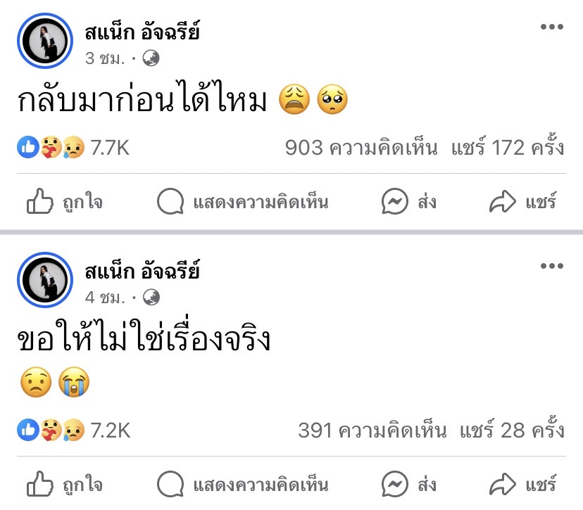 ซึ่งสาว “สแน็ก” ได้โพสต์ในเฟซบุ๊คข้อความว่า “ขอให้ไม่ใช่เรื่องจริง” และโพสต์อีกครั้งระบุว่า “กลับมาก่อนได้ไหม”