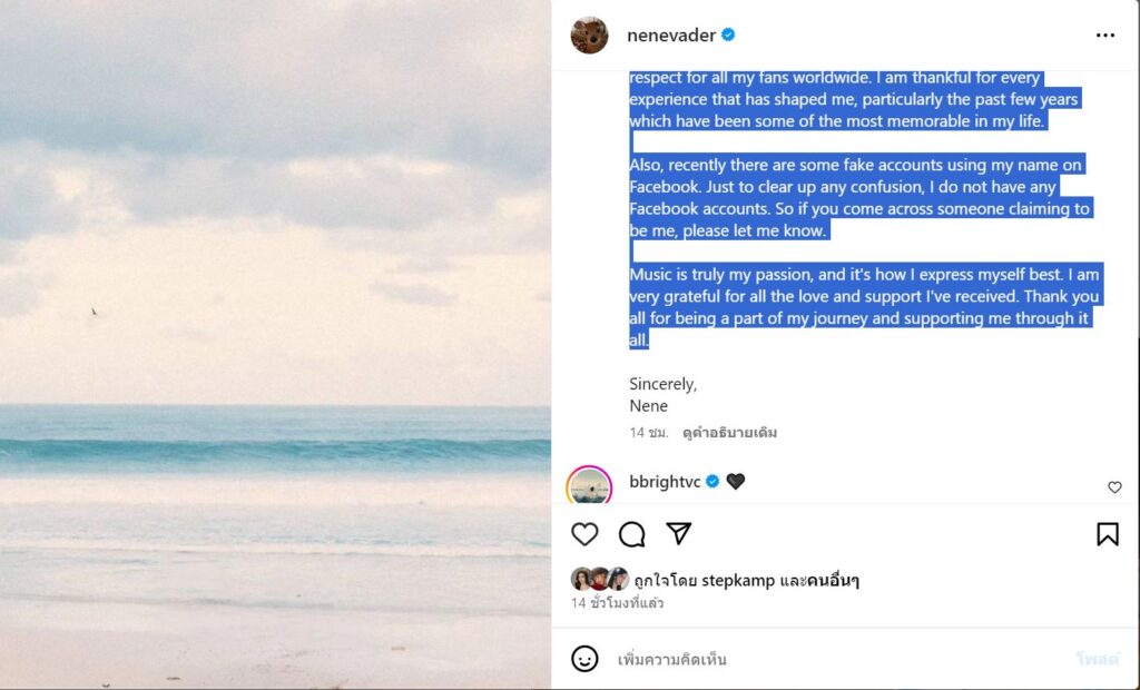 จากนั้น “เนเน่ พรนับพัน” ได้เคลื่อนไหว ผ่านอินสตาแกรมของเธอ โพสต์ภาพท้องฟ้า พร้อมกับประกาศกับทุกคนว่าตอนนี้เธอ กำลังคบหาอยู่กับ “ไบร์ท วชิรวิชญ์” จริง โดยได้ระบุข้อความว่า…ถึงทุกคน, สวัสดี Neon Atoms (ชื่อแฟนคลับเนเน่) ที่รักของฉัน เพื่อน พี่น้อง และน้องสาวของฉัน ทุกคนเป็นอย่างไรบ้าง? ฉันอยากจะพูดคุยเล็กน้อยเกี่ยวกับข่าวล่าสุดที่อาจทำให้คุณประหลาดใจ ฉันเข้าใจว่าอาจทำให้เกิดความสับสนและใช้ทรัพยากรสาธารณะโดยไม่จำเป็น และฉันขอโทษสำหรับสิ่งนั้น
