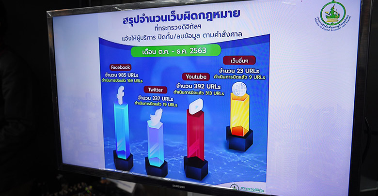 นายพุทธิพงษ์ ปุณณกันต์ รัฐมนตรีกระทรวงดิจิทัลเพื่อเศรษฐกิจและสังคม (ดีอีเอส) แถลงการดำเนินคดีเว็บไซต์ผิดกฎหมาย ระหว่างวันที่ 13 ต.ค. – 4 ธ.ค. 63 พบผู้กระทำความผิด ทั้งสิ้น 496 URL แบ่งเป็น เฟซบุ๊ก 284, ยูทูบ 81, ทวิตเตอร์ 130 และอื่นๆ 1 URL นายพุทธิพงษ์ กล่าวว่า ที่ผ่านมากระทรวงดิจิทัลเพื่อเศรษฐกิจและสังคม โดยกองป้องกันและปราบปรามการกระทำความผิดทางเทคโนโลยีสารสนเทศ (ปท.) กองกฎหมาย ศูนย์ปราบปรามอาชญากรรมทางเทคโนโลยีสารสนเทศ สำนักงานตำรวจแห่งชาติ (ศปอส.ตร.) และกองบังคับการปราบปรามการกระทำความผิดเกี่ยวกับอาชญากรรมทางเทคโนโลยี (บก.ปอท.) ได้ร่วมกันตรวจสอบการกระทำที่อาจเข้าข่ายความผิดบนสื่อสังคมออนไลน์ตาม พ.ร.บ. คอมพิวเตอร์ฯ และกฎหมายอื่นที่เกี่ยวข้อง ในช่วงวันที่ 13 ต.ค. – 4 ธ.ค.63 พบผู้กระทำความผิด ทั้งสิ้น 496 URL ซึ่งทางเจ้าหน้าที่ได้ดำเนินการพิสูจน์ทราบตัวตนบุคคลแล้ว จำนวน 19 บัญชี แบ่งเป็น เฟซบุ๊ก 15 ราย และ ทวิตเตอร์ 4 ราย โดยส่งข้อมูลผู้กระทำความผิดให้ บก.ปอท. ดำเนินการในส่วนที่เกี่ยวข้องตามกฎหมายแล้ว