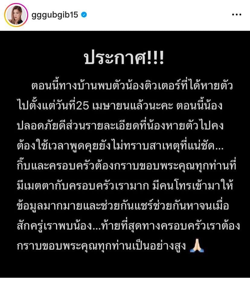 ล่าสุดสาว”กุ๊บกิ๊บ” ออกมาแจ้งข่าวดีว่าเจอหลานชายเป็นที่เรียบร้อยแล้ว โดยโพสต์ข้อความว่า “ตอนนี้ เจอน้องติวเตอร์ หลานของกุ๊บกิ๊บแล้วนะคะ หลังจากหายไปตั้งแต่วันที่ 25 เมษายน น้องปลอดภัยดีส่วนรายละเอียดที่น้องหายตัวไป คงต้องใช้เวลาพูดคุยยังไม่ทราบสาเหตุที่แน่ชัด กิ๊บและครอบครัวต้องกราบขอบพระคุณทุกท่าน ที่มีเมตตาต่อครอบครัวของเรามาก มีคนโทรเข้ามาให้ข้อมูลมากมายและช่วยกันแชร์ด้วยกันหาจนเมื่อสักครู่เราพบน้อง….ท้ายที่สุดทางครอบครัวเราต้องกราบขอบพระคุณทุกท่านเป็นอย่างสูง”