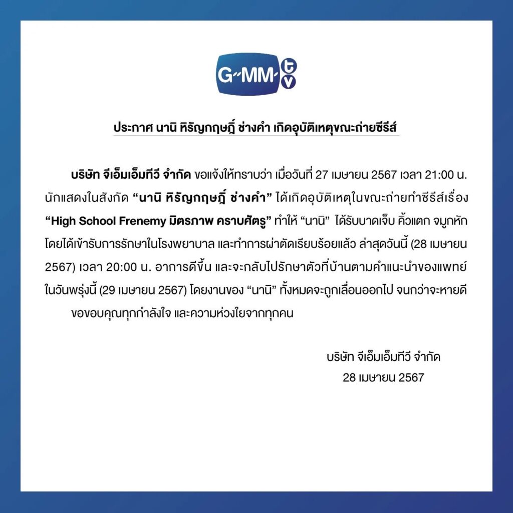 บริษัท จีเอ็มเอ็มทีวี จำกัด ขอแจ้งให้ทราบว่า เมื่อวันที่ 27 เมษายน 2567 เวลา 21:00 น. นักแสดงในสังกัด “นานิ หิรัญกฤษฎิ์ ช่างคำ” ได้เกิดอุบัติเหตุในขณะถ่ายทำชีรีส์เรื่อง “High School Frenemy มิตรภาพ คราบศัตรู” ทำให้ “นานิ” ได้รับบาดเจ็บ คิ้วแตก จมูกหัก