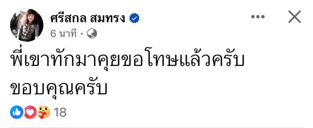 ล่าสุดทาง “ปุ้ย แอลกอฮอล์” ได้อัปเดตผ่านหน้าเฟซบุ๊กว่า “พี่เขาทักมาคุยขอโทษแล้วครับ ขอบคุณครับ”