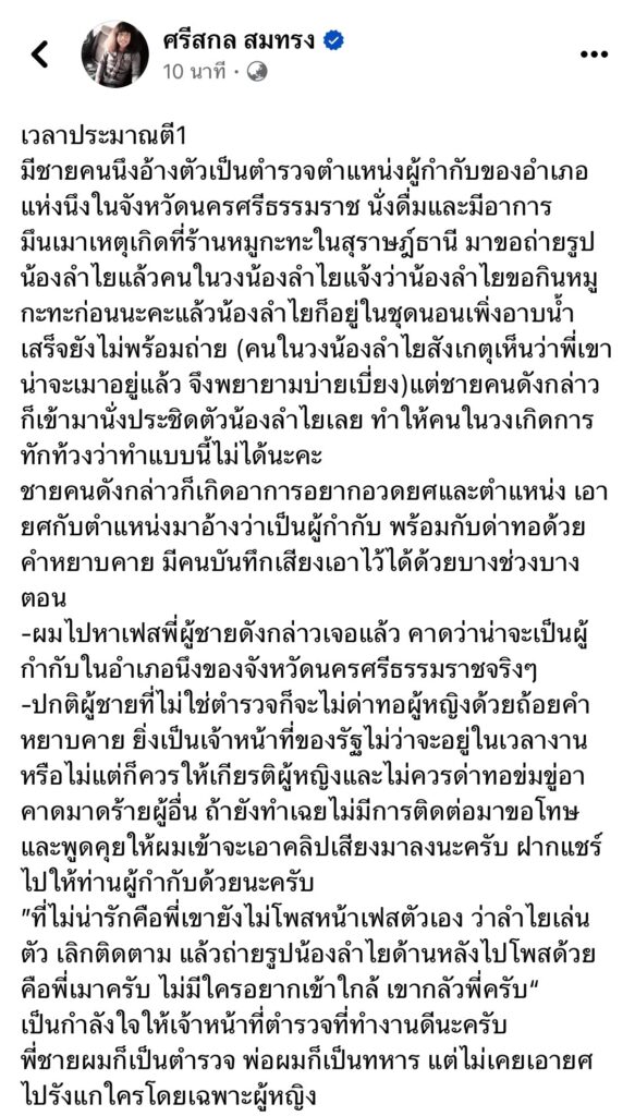 ทำเอาแฟนๆฉุนแทน เมื่อล่าสุด “ปุ้ย แอลกอฮอล์” แฟนหนุ่มของหมอลำสาว “ลำไย ไหทองคำ” โพสต์เฟซบุ๊กส่วนตัว “ศรีสกล สมทรง” เล่าเหตุการณ์ที่เกิดขึ้นที่จังหวัดสุราษฎ์ธานี มีชายอ้างตัวเป็นตำรวจยศผู้กำกับ ของอำเภอหนึ่ง นครศรีธรรมราช นั่งดื่มและมีอาการมึนเมาเข้ามาขอถ่ายรูปกับ “ลำไย ไหทองคำ” ขณะนั่งกินหมูกระทะกับทีมงาน และทางทีมงานได้แจ้งแล้วว่าขอให้ ลำไย ทานหมูกระทะก่อนและอยู่ในชุดที่ยังไม่พร้อมถ่าย แต่ชายคนดังกล่าวเข้ามานั่งประชิดตัว และพอทีมงานทักท้วง ก็อวดยศอวดตำแหน่งอีกทั้งยังด่าด้วยถ้อยคำหยาบคาย