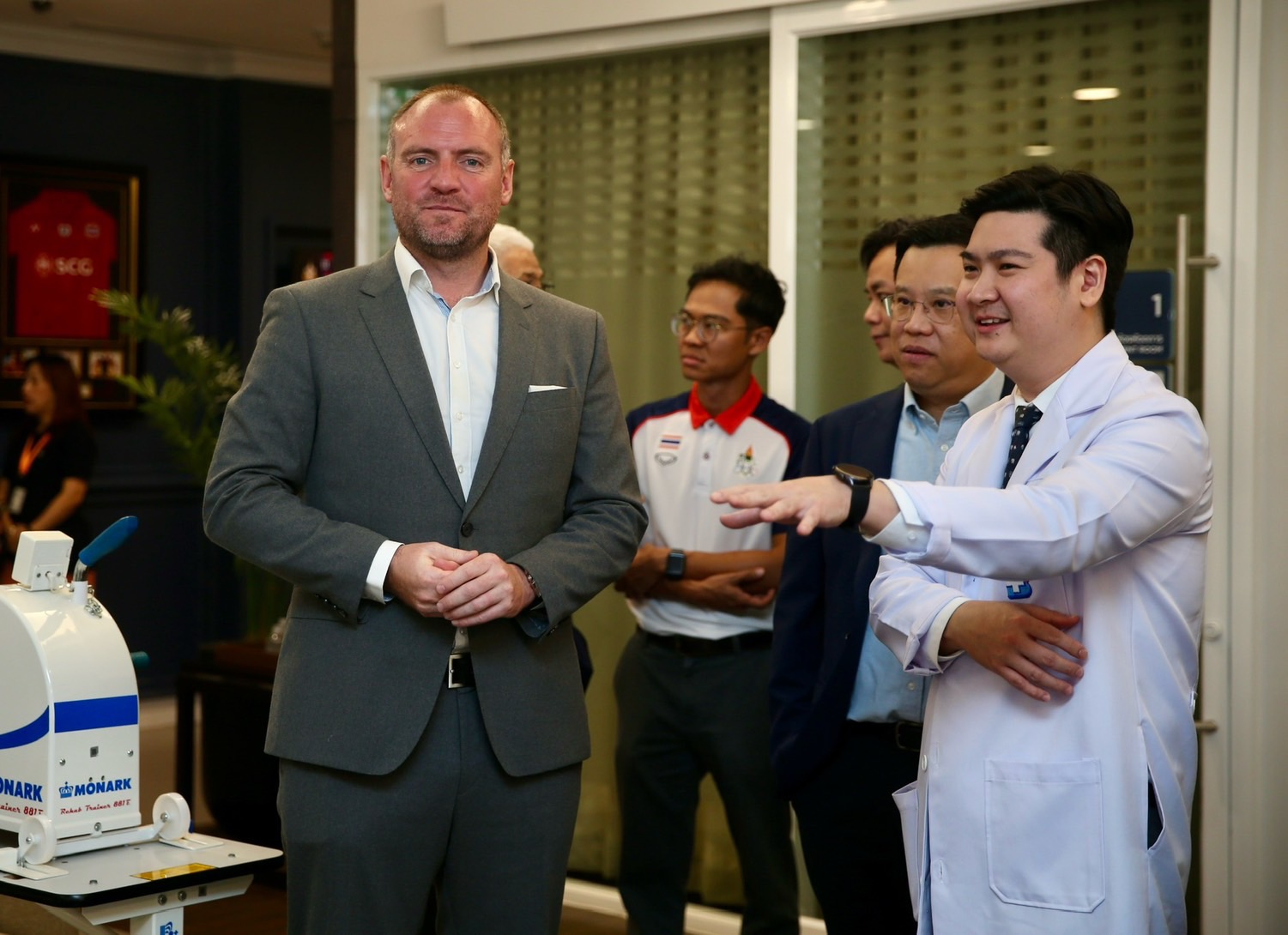 “รวมทั้งในด้านการรักษาในกรณีบาดเจ็บจากการเล่นฟุตบอลด้วยแพทย์ผู้ชำนาญการทางด้านกระดูกและข้อ เฉพาะทางด้านเวชศาตร์การกีฬา พร้อมด้วยเทคโนโลยีที่ทันสมัย ตลอดจนอุปกรณ์ ที่ทันสมัย ด้านเวชศาสตร์ฟื้นฟูและกายภาพบำบัด เช่น การฝึกวิ่งบนลู่วิ่งที่ลดแรงกระแทกด้วยการลดความดัน บรรยากาศที่เรียกว่า Alter G Anti-Gravity Treadmill นอกจากนี้ยังมีสนามฟุตบอลหญ้าเทียมเพื่อเป็นการฟื้นฟูการเล่นฟุตบอลในสนามเสมือนจริง ที่เรียกการฟื้นฟูแบบนี้ว่า Field Rehabilitation ที่จะทำให้นักฟุตบอลที่บาดเจ็บ สามารถกลับไปเล่นฟุตบอลได้เหมือนเดิมโดยเร็วที่สุด เทียบเท่าสถาบันทางการแพทย์ชั้นนำใน ประเทศอังกฤษและยุโรป ที่ให้การรักษานักฟุตบอลอาชีพชั้นนำที่บาดเจ็บและกลับไปเป็นนักฟุตบอลอาชีพได้ต่อไป”