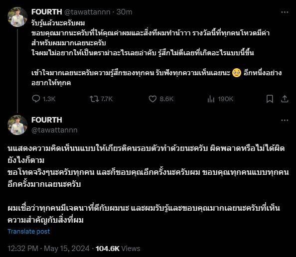 ชี้แจงแล้ว! “โฟร์ท ณัฐวรรธน์” รับรู้สึกไม่ดีไม่ไปรับรางวัล วอนทุกคนอย่าดราม่า ขอบคุณที่ซัพพอร์ตกัน เชื่อทุกคนมีเจตนาที่ดี