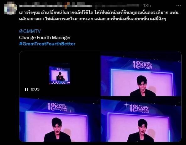 กลายเป็นดราม่าร้อนระอุบนโลกออนไลน์สำหรับนักแสดงหนุ่ม “โฟร์ท ณัฐวรรธน์” หลังเจ้าตัวได้คว้ารางวัลหนุ่มวัยใสโดนใจแห่งปี 2023 ในงานประกาศผลรางวัล Kazz Awards 2024 แต่ดันไม่เดินทางมารับรางวัลด้วยตัวเองเนื่องจากติดภาระกิจเลยไม่สามารถเดินทางมาได้ ซึ่งทำแฟนคลับบางกลุ่มเกิดความไม่พอใจเข้ามาต่อว่าทางค่ายว่า ควรเมเนจเวลาให้ศิลปินมากกว่านี้ ,ถ้าเปลี่ยนเป็นคลิปแล้วให้น้องมายืนบนเวทีน่าจะดี , อยากเห็นน้องยืนพูดบนเวที , คิดว่าทางค่ายน่าจะรับเรื่องแล้วนะ ควรแก้ไขปัญหาให้เหมาะสม เพราะพวกเราเต็มที่กับการซัพพอร์ต