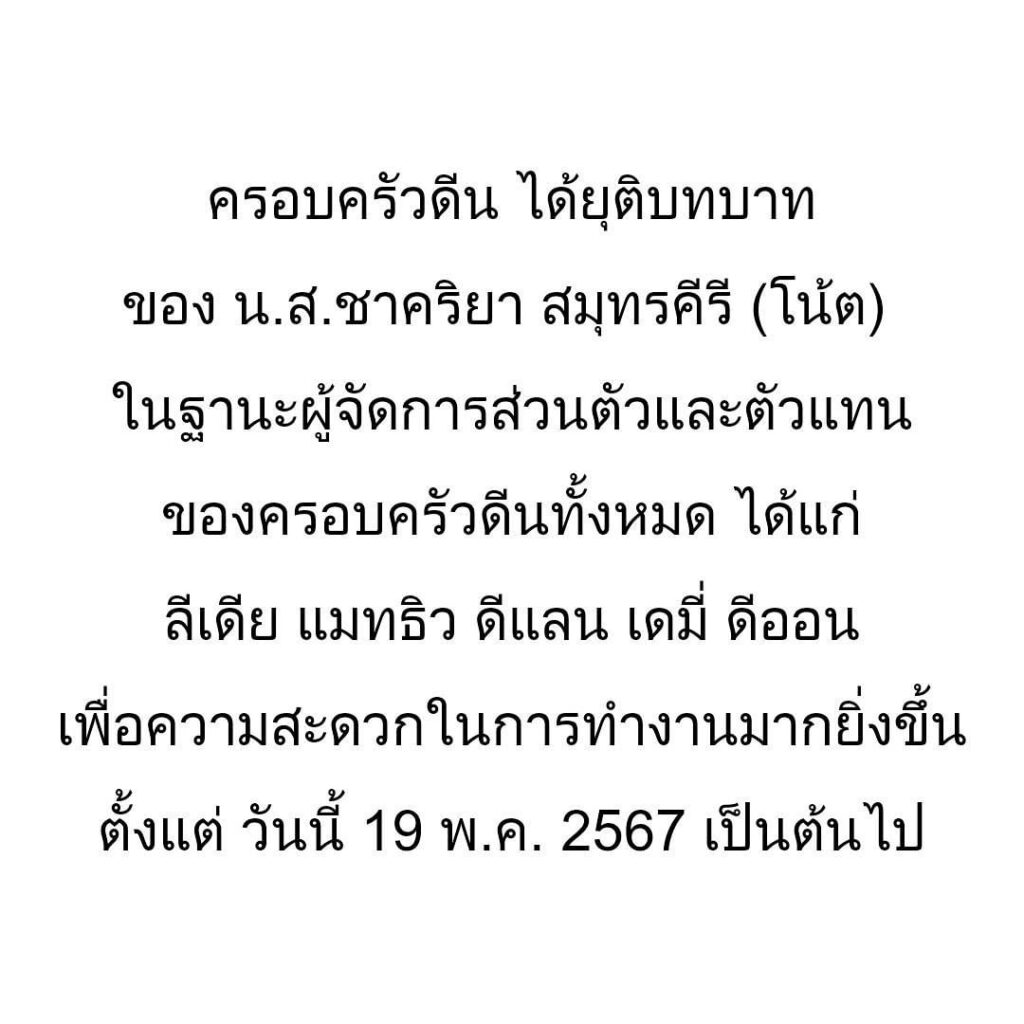ซึ่งระบุข้อความว่า “ครอบครัวดีน ได้ยุติบทบาท ของ น.ส.ชาคริยา สมุทรคีรี (โน้ต) ในฐานะผู้จัดการส่วนตัวและตัวแทนของครอบครัวดีนทั้งหมด ได้แก่ ลีเดีย แมทธิว ดีแลน เดมี่ ดีออน เพื่อความสะดวกในการทำงานมากยิ่งขึ้นตั้งแต่ วันนี้ 19 พ.ค. 2567 เป็นต้นไป”