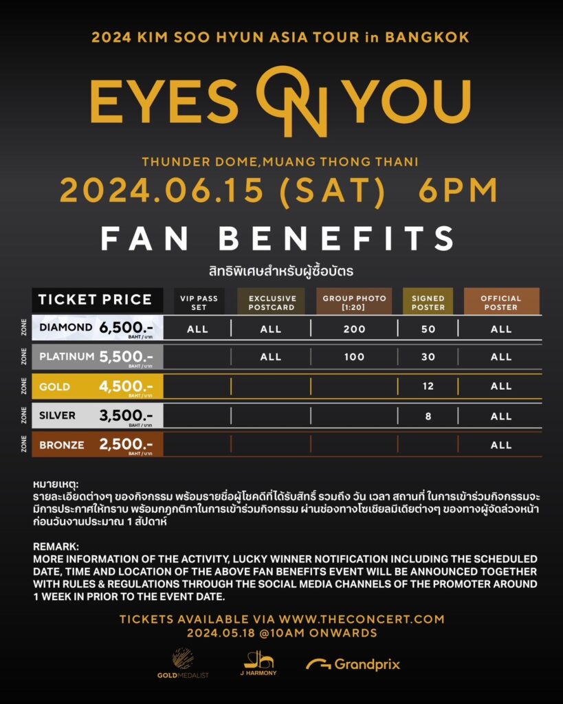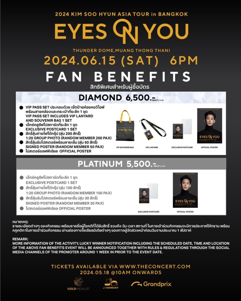 กลับมาครั้งนี้พิเศษกว่าครั้งก่อนแน่นอน “คิมซูฮยอน” กำลังซุ่มซ้อมโชว์มาโปรยเสน่ห์ และมอบความสุขให้กับแฟนๆ เตรียมมาสัมผัสความอบอุ่นละมุนใจ หรือจะคลั่งรักเบอร์แรงแบบ “แบคฮยอนอู” ต้องมาเจอเท่านั้นถึงจะรู้!! งาน “2024 KIM SOO HYUN ASIA TOUR in BANGKOK” เปิดขายบัตรวันเสาร์ที่ 18 พฤษภาคมนี้ ผ่านทาง The Concert Application หรือ www.theconcert.com บัตรราคา 6,500 / 5,500 / 4,500 / 3,500 และ 2,500 บาท พิเศษสุดๆ สำหรับบัตรราคา 6,500 และราคา 5,500 บาท มีโอกาสลุ้นรับสิทธิ์ถ่ายภาพ Group Photo [1:20] กับคิมซูฮยอนอย่างใกล้ชิด และยังมีสิทธิพิเศษอื่นๆ อีกด้วย