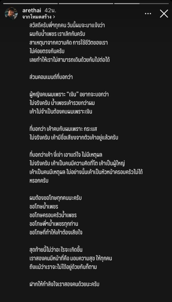 ซึ่งล่าสุด ”อาไท“ได้ออกมาเคลื่อนไหวผ่านสตอรี่ ยอมรับจบความสัมพันธ์กันจริง พร้อมร่ายยาวเผยสาเหตุว่า “สวัสดีครับพี่ ๆ ทุกคน วันนี้ผมจะมาแจ้งว่าผมกับน้ำเพชร เราเลิกกันครับ สาเหตุมาจากความคิด การใช้ชีวิตของเราไม่ค่อยตรงกันครับ เลยทำให้เราไม่สามารถเดินด้วยกันไปต่อได้