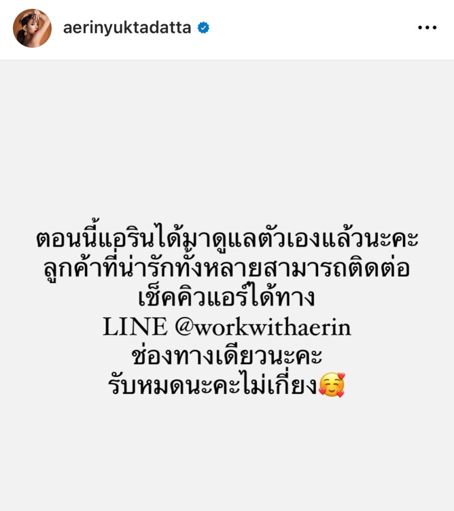 ล่าสุดว่าที่คุณแม่คนสวย “แอริน ยุกตะทัต” ก็ออกมาประกาศว่าตอนนี้ได้ออกมาดูตัวเองแบบเต็มตัวแล้ว “ตอนนี้แอริน ได้มาดูแลตัวเองแล้วนะคะ ลูกค้าที่น่ารักทั้งหลายสามารถติดต่อ เช็คคิวแอร์ได้ทาง LINE @workwithaerin ช่องทางเดียวนะคะรับหมดนะคะไม่เกี่ยง”