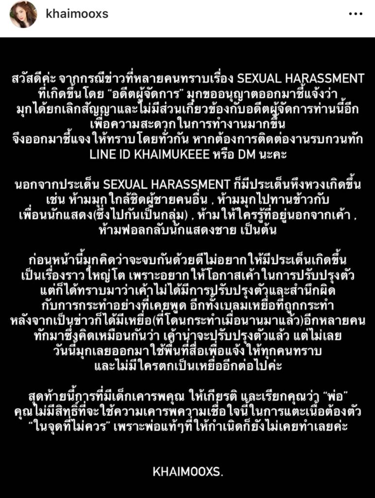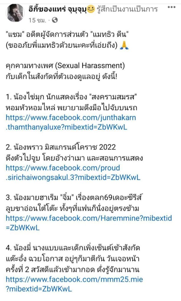 เมื่อล่าสุดเพจ อีกี้ของแทร่ จุบุจุบุ ก็ออกมาโพสต์แฉพฤติกรรมของอดีตผู้จัดการ ดารา พิธีกรค่ายมวย ที่มีพฤติกรรมคุกคามทางเพศ (Sexual Harassment) กับเด็กในสังกัดที่ดูแลอยู่ ไม่ว่าจะเป็นการ หอมหัวหอมไหล่ พยายามดึงมือไปจับบนรถ ดึงตัวไปจูบ โดยอ้างว่าเมา และสอนการแสดง ลูบขาอ่อนใต้โต๊ะ ทั้งๆที่แฟนก็นั่งอยู่ตรงข้าม แต๊ะอั๋ง ฉวยโอกาส อยู่ๆก็มาตีก้น วันเจอหน้า ครั้งที่ 2 สวัสดีแล้วเข้ามากอด ดั่งรู้จักมานาน และยังมีอีกเรื่อยๆที่ทยอยรวมตัวจ่อเอาผิดอดีตผู้จัดการคนดังกล่าว