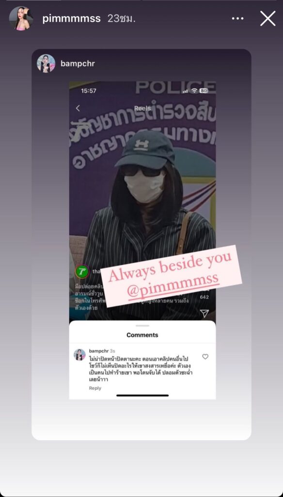 ล่าสุดในอินสตาแกรมของ “พิม กรกนก” ได้แชร์สตอรี่ภาพจากชาวเน็ต ที่แสดงความคิดเห็นถึงเรื่องดังกล่าว ว่า “ไม่น่าปิดหน้าปิดตานะคะ ตอนเอาคลิปคนอื่นไปลงโชว์ก็ไม่เห็นปิดอะไรให้เขาสงสารเหยื่อค่ะ ตัวเองเป็นคนไปทำร้ายเขา พอโดนจับได้ ปลอมตัวฉ่ำเลยน้า” พร้อมข้อความที่ส่งกำลังใจให้เจ้าตัวว่า “Always beside you”
