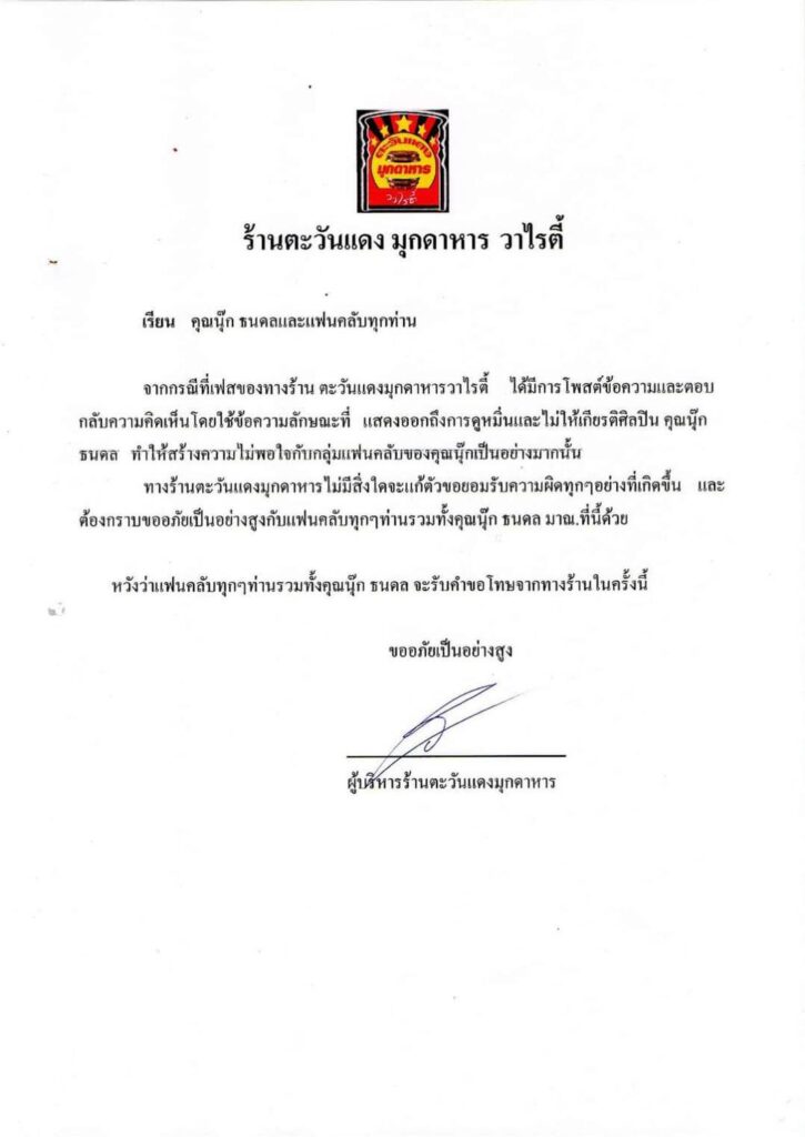 ต่อมาทางด้านร้านดังกล่าวก็ทนกระแสไม่ไหว ออกมาลบข้อความพร้อมร่อนจดหมายขอโทษกับสิ่งที่เกิดขึ้นว่า “
