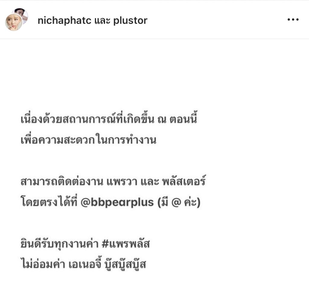 ล่าสุดทางด้านนักแสดงสาวสวย “แพรวา ณิชาภัทร” และ “พลัสเตอร์” ได้ออกมาประกาศรับงานเอง โดยโพสต์ข้อความ “เนื่องด้วยสถานการณ์ที่เกิดขึ้น ณ ตอนนี้ เพื่อความสะดวกในการทำงาน สามารถติดต่องาน แพรวา และ พลัสเตอร์ โดยตรงได้ที่ @bbpearplas (มี@ ค่ะ) ยินดีรับทุกงานค่า #แพรพลัส ไม่อ่อมค่า เอเนอจี้ บู๊สบู๊สบู๊ส “ พร้อมระบุแคปชั่น “FYI นะค่าพี่ๆ ตามที่แจ้งเลยค่า”