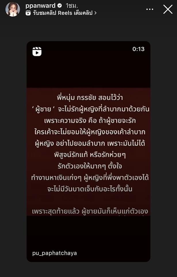 ล่าสุดทำเอาชาวเน็ตแอบสะดุ้งสนั่น เมื่อเจ้าตัวออกมาแชร์คำคมเป็นคำพูดของ “หนุ่ม กรรชัย” ลงในไอจีสตอรี่ ที่เขียนว่า “พี่หนุ่ม กรรชัย สอนไว้ว่า ‘ ผู้ชาย ‘ จะไม่รักผู้หญิงที่ลำบากมาด้วยกัน เพราะความจริง คือ ถ้าผู้ชายจะรัก ใครเค้าจะไม่ยอมให้ผู้หญิงของเค้าลำบาก ผู้หญิง อย่าไปยอมลำบาก เพราะมันไม่ได้ พิสูจน์รักแท้ หรือรักห่วยๆ รักตัวเองให้มากๆ ตั้งใจ ทำงานหาเงินเก่งๆ ผู้หญิงที่พึ่งพาตัวเองได้ จะไม่มีวันบาดเจ็บกับอะไรทั้งนั้น เพราะสุดท้ายแล้ว ผู้ชายมันก็เห็นแก่ตัวเอง”