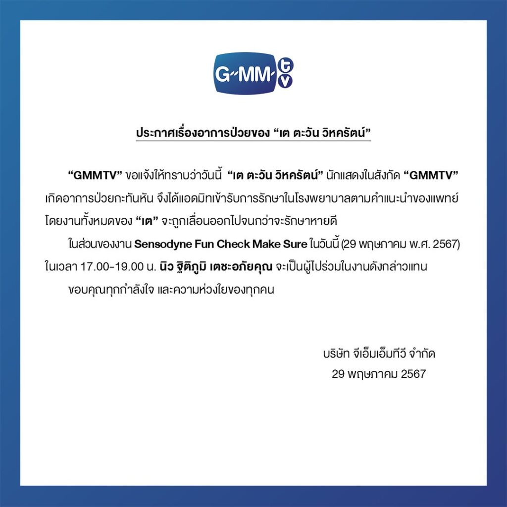GMMTV ต้นสังกัดของนักแสดงหนุ่ม “เต ตะวัน วิหครัตน์” ออกจดหมายแจ้งอาการป่วยของนักแสดงหนุ่ม หลังต้องเข้าแอดมิทโรงพยาบาลตามคำแนะนำของแพทย์ และขอโทษที่ต้องเลื่อนงานออกไปจนกว่าจะหายดี