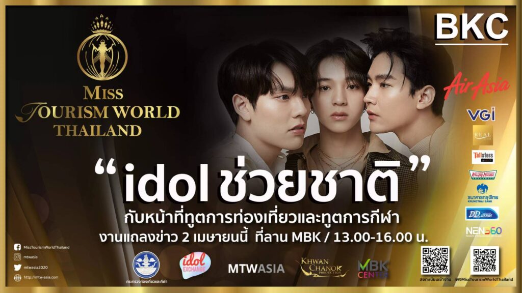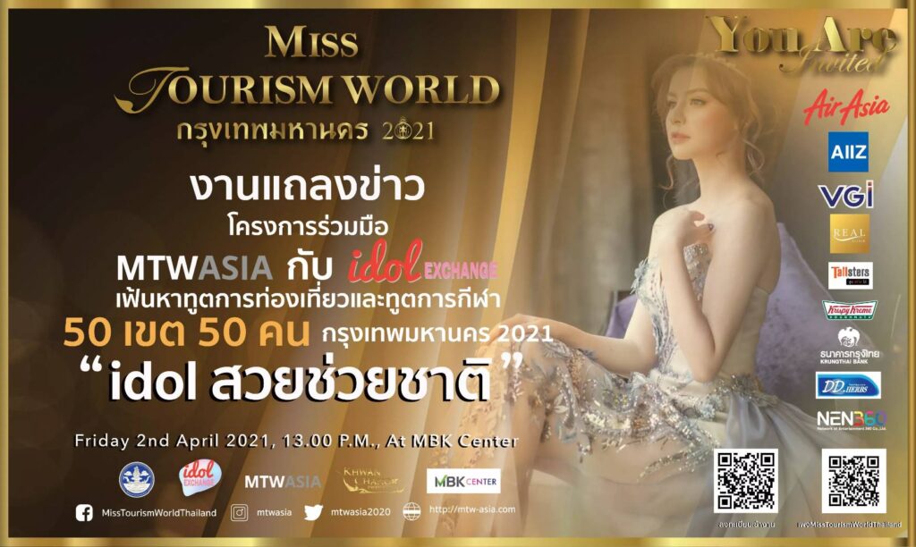 กรุงเทพมหานคร โดย สำนักวัฒนธรรมกีฬา และการท่องเที่ยว, MTWASIA และ Idol Exchangeจับมือสร้างความแปลกใหม่บนโลกออนไลน์ ด้วยตำแหน่งทูตการท่องเที่ยว ที่จะทำหน้าที่ช่วยเหลือภาครัฐและเอกชน เข้าถึงกลุ่มชุมชนอย่างยั่งยืน ด้วยคอนเซ็ปท์Idolสวยช่วยชาติกับโปรเจ็กต์Miss Tourism World Bangkok 2021เฟ้นหาสาวไทยที่มีอายุ18-28ปี มาร่วมท้าทายด้วยกิจกรรมมากมายกับกูรูคนสำคัญเพื่อผ่านเข้ารอบ ยกระดับให้เป็นผู้ทรงอิทธิพลบนโลกออนไลน์อย่างแท้จริงพร้อมรับสายสะพายอันทรงเกียรติจากผู้ว่าราชการกรุงเทพมหานคร ผู้อำนวยการสำนักวัฒนธรรมกีฬาและการท่องเที่ยว รองผู้ว่ากรุงเทพมหานคร ให้เป็นทูตการท่องเที่ยวและทูตการกีฬาประจำ50เขต 50 คนของกรุงเทพมหานคร