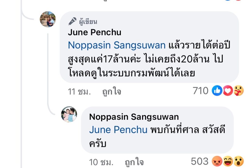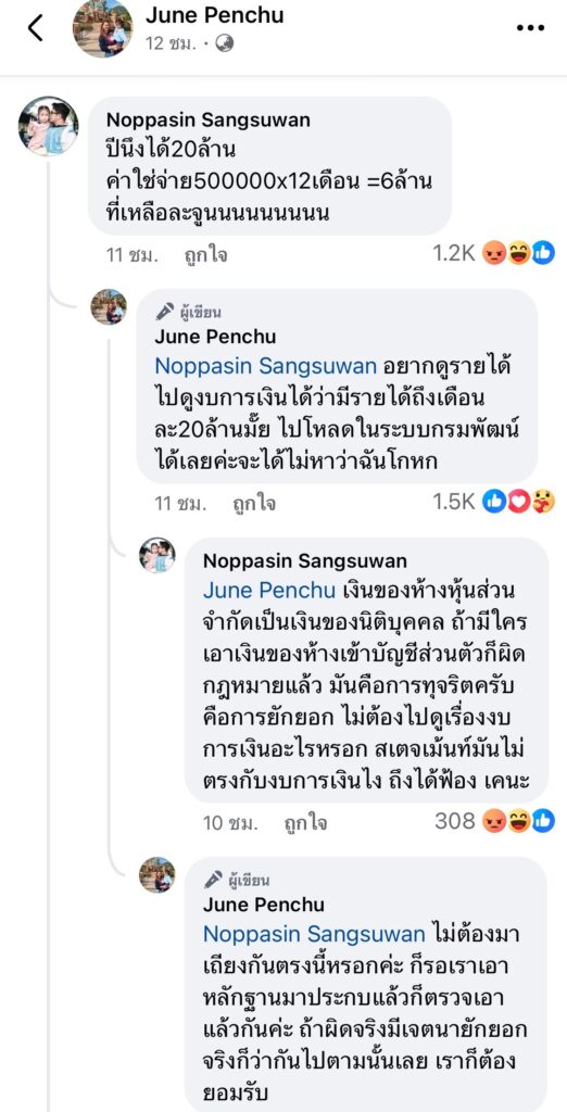 และ จูนได้ ตอบกลับว่า  อยากดูรายได้ไปดูงบการเงินได้ว่ามีรายได้ถึงเดือนละ20ล้านมั๊ย ไปโหลดในระบบกรมพัฒน์ได้เลยค่ะจะได้ไม่หาว่าฉันโกหกและแล้วรายได้ต่อปีสูงสุดแค่17ล้านค่ะ ไม่เคยถึง20ล้าน ไปโหลดดูในระบบกรมพัฒน์ได้เลย