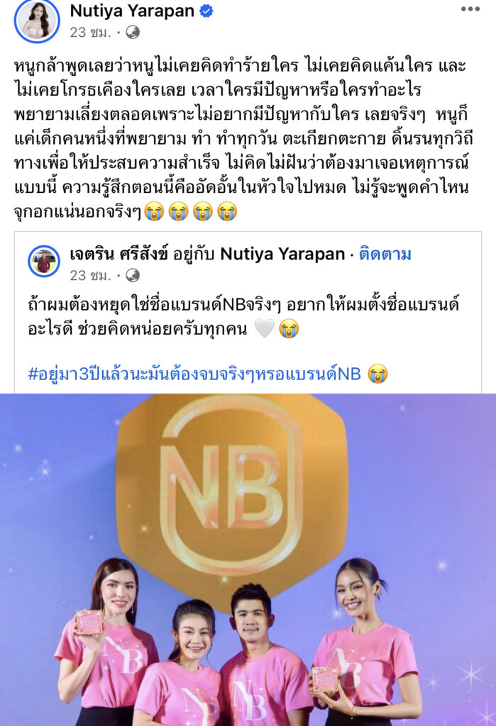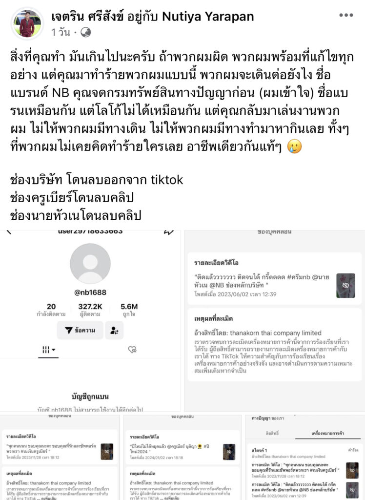 โดยทางด้าน “เนเงิน” ออกมาโพสต์ว่า “สิ่งที่คุณทำ มันเกินไปนะครับ ถ้าพวกผมผิด พวกผมพร้อมที่แก้ไขทุกอย่าง แต่คุณมาทำร้ายพวกผมแบบนี้ พวกผมจะเดินต่อยังไง ชื่อแบรนด์ NB คุณจดกรมทรัพย์สินทางปัญญาก่อน (ผมเข้าใจ) ชื่อแบรนด์เหมือนกัน แต่โลโก้ไม่ได้เหมือนกัน แต่คุณกลับมาเล่นงานพวกผม ไม่ให้พวกผมมีทางเดิน ไม่ให้พวกผมมีทางทำมาหากินเลย ทั้งๆที่พวกผมไม่เคยคิดทำร้ายใครเลย อาชีพเดียวกันแท้ๆ 🥲ช่องบริษัท โดนลบออกจากtiktokช่องครูเบียร์โดนลบคลิป ช่องนายหัวเนโดนลบคลิป
