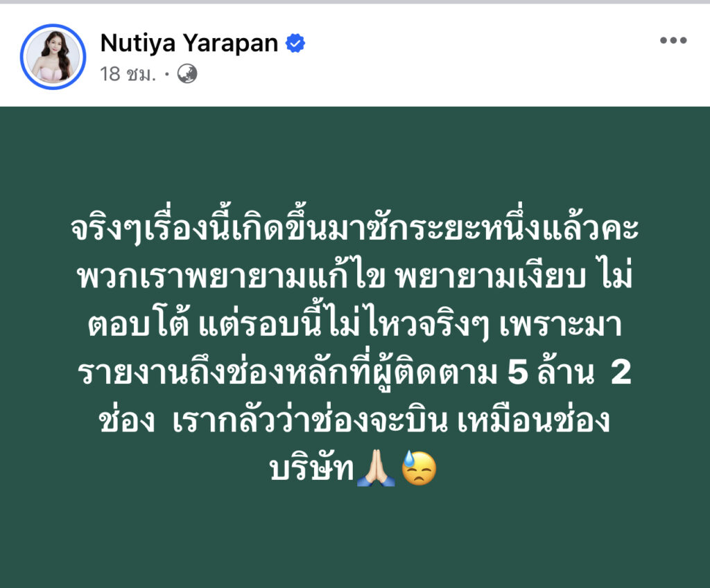 และได้โพสต์อีกว่า “จริงๆเรื่องนี้เกิดมาสักระยะหนึ่งแล้วคะ พวกเราพยายามแก้ไข พยายามเงียบ ไม่ตอบโต้แต่ว่ารอบนี้ไม่ไหว เพราะมารายงานถึงช่องหลักผู้ติดตาม 5 ล้าน 2ช่อง เรากลัวว่าช่องเราจะบินเหมือนช่องบริษัท”