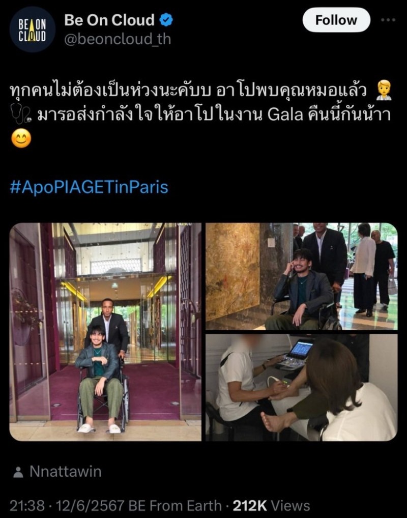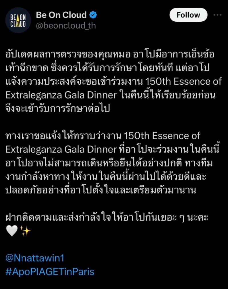 ล่าสุดทางต้นสังกัด Be On Cloud ได้ออกมาอัพเดทอาการของ “อาโบ” ว่า “ผลการตรวจของคุณหมอ อาโปมีอาการเอ็นข้อเท้าฉีกขาด ซึ่งควรได้รับการรักษาโดยทันที แต่อาโปแจ้งความประสงค์จะขอเข้าร่วมงาน 150th Essence of Extraleganza Gala Dinner ในคืนนี้ให้เรียบร้อยก่อนจึงจะเข้ารับการรักษาต่อไป ทางเราขอแจ้งให้ทราบว่างาน 150th Essence of Extraleganza Gala Dinner ที่อาโปจะร่วมงานในคืนนี้ อาโปอาจไม่สามารถเดินหรือยืนได้อย่างปกติ ทางทีมงานกำลังหาทางให้งานในคืนนี้ผ่านไปได้ด้วยดีและปลอดภัยอย่างที่อาโปตั้งใจและเตรียมตัวมานาน