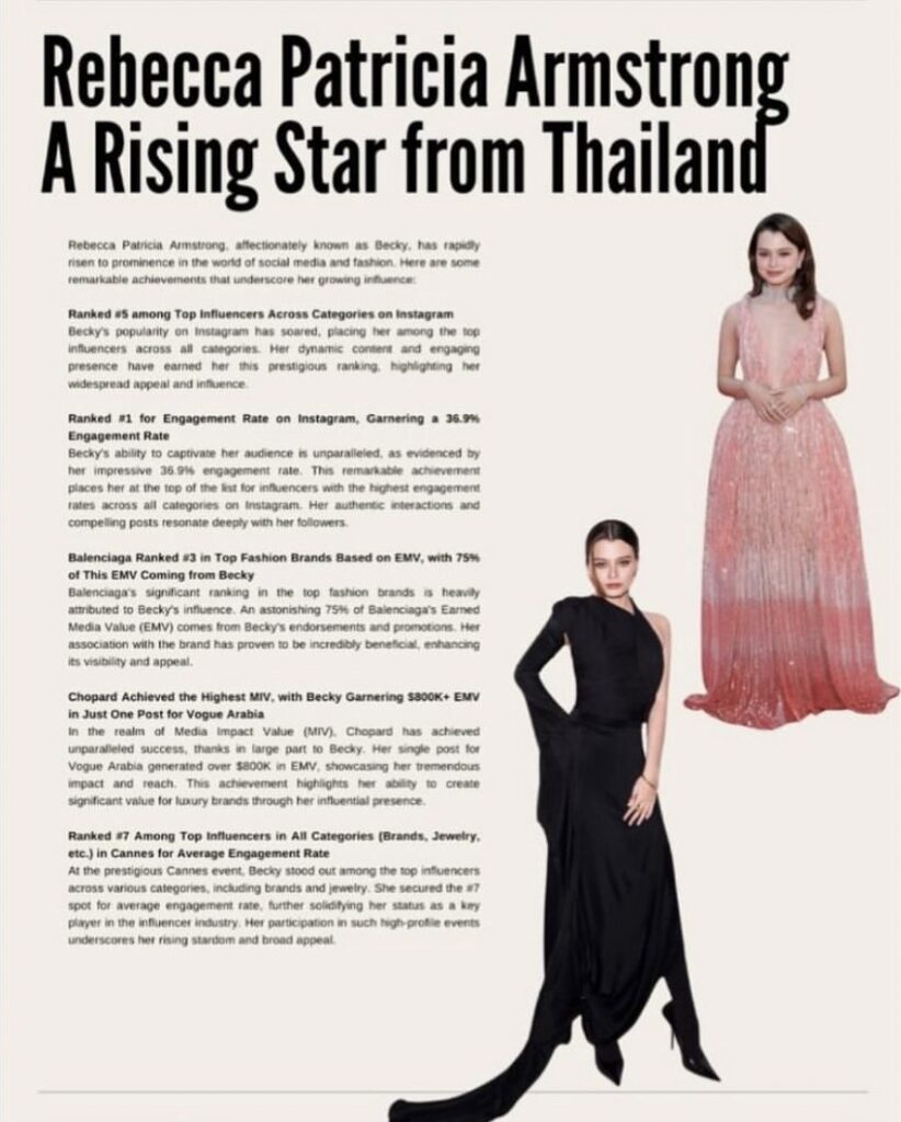 สร้างความเซอร์ไพรส์ให้แฟนๆชาวไทยอย่างมาก หลังสื่อต่างประเทศ vogue business นำเสนอข่าวสารสรุปตัวเลขผู้ทรงอิทธิพลที่สุดหลังจบบิ๊กอีเว้นท์ เทศกาลหนังเมืองคานส์ ที่ประเทศฝรั่งเศส จัดอันดับยกให้นักแสดงดาวรุ่งคนไทย “เบ็คกี้ รีเบคก้า แพทรีเซีย อาร์มสตรอง” ยืนหนึ่งไทยแลนด์จากซีรีส์เกิร์ลเลิฟ สร้างประวัติศาสตร์ความฮอตทะลุสื่อโซเชียลมากที่สุด จากการเลือกสวมใส่พรีเซ็นต์เสื้อผ้าแบรนด์ดัง Balenciaga ปรากฏโฉมบนพรมแดงเมืองคานส์ ดันมูลค่าครองความฮอตทุกโซเชียลออนไลน์ เพียงโพสต์ภาพ 3 โพสต์ ลงช่องทางสื่อของตัวเอง สร้างมูลค่ามีเดียตัวเลขให้แบรนด์ดังพุ่งทะยานไปถึง 3.8 ล้านเหรียญสหรัฐ พร้อมกับอัตราการมีส่วนร่วม 75% ให้กับแบรนด์ Balenciaga ของการจัดอันดับบุคคลที่สร้างมูลค่าทางสื่อมากที่สุดสำหรับงานเทศกาลหนังเมืองคานส์ในซีซันนี้