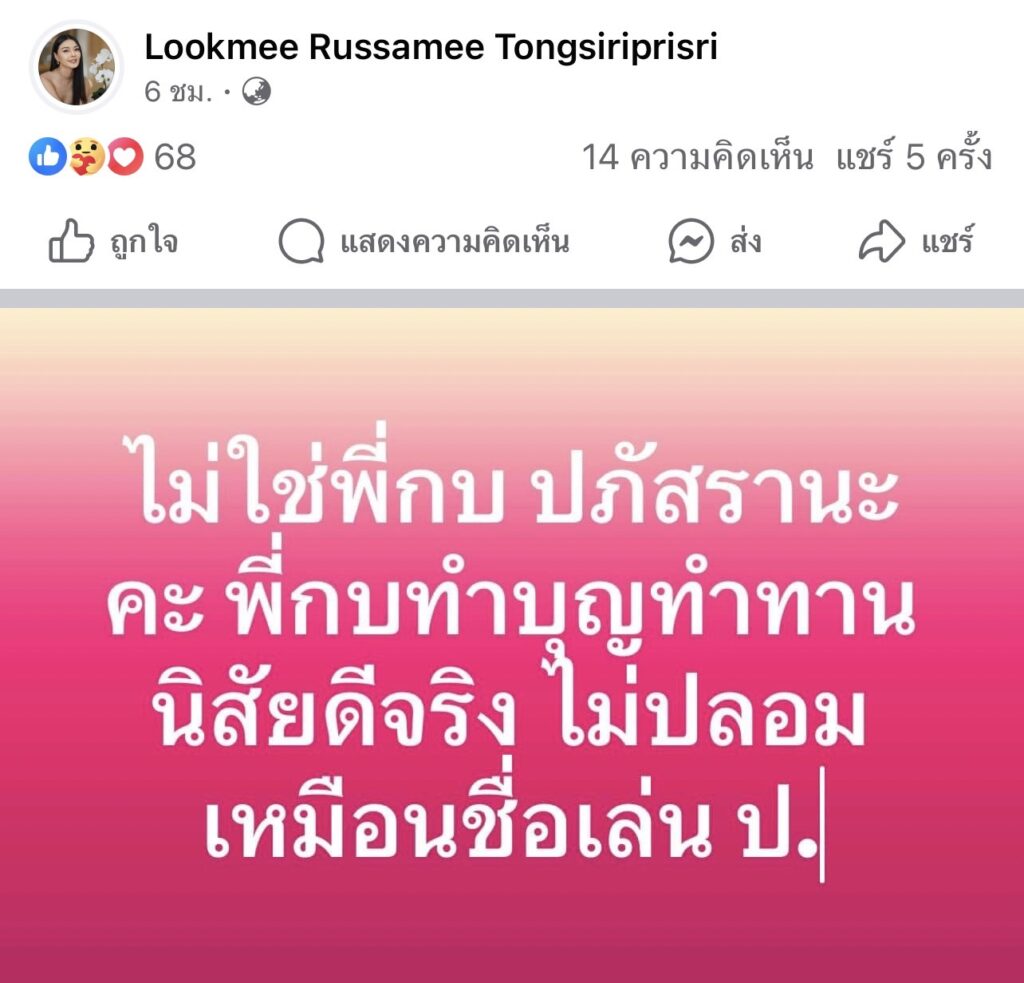 ท่ามกลางชาวเน็ตสงสัยว่าเอ๊ะดาราคนดังกล่าวเป็นใคร ซึ่งก็มีชื่อของอดีตนักแสดงสาว “กบ ปภัสรา” งานนี้ทำเอา “ลูกหมี” ต้องรีบออกมาแก้ข่าว โดยชี้แจงผ่านทางเฟซบุ๊กส่วนตัวว่า “ไม่ใช่พี่กบ ปภัสรานะคะ พี่กบทำบุญทำทาน นิสัยดีจริง ไม่ปลอม เหมือนชื่อเล่น ป.”