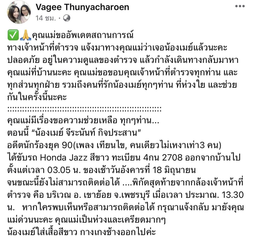 ล่าสุดตำรวจได้พบตัวของนักร้องเป็นที่เรียบร้อย ซึ่งปลอดภัยดี โดยคุณแม่ได้ออกมาโพสต์อีกครั้งว่า “ทางเจ้าหน้าที่ตำรวจ แจ้งมาทางคุณแม่ว่าเจอน้องเมย์แล้วนะคะ ปลอดภัย อยู่ในความดูแลของตำรวจ แล้วกำลังเดินทางกลับมาหาคุณแม่ที่บ้านนะคะ คุณแม่ขอขอบคุณเจ้าหน้าที่ตำรวจทุกท่าน และทุกส่วนทุกฝ่าย รวมถึงคนที่รักน้องเมย์ทุกๆ ท่าน ที่ห่วงใย และช่วยกันในครั้งนี้นะคะ”