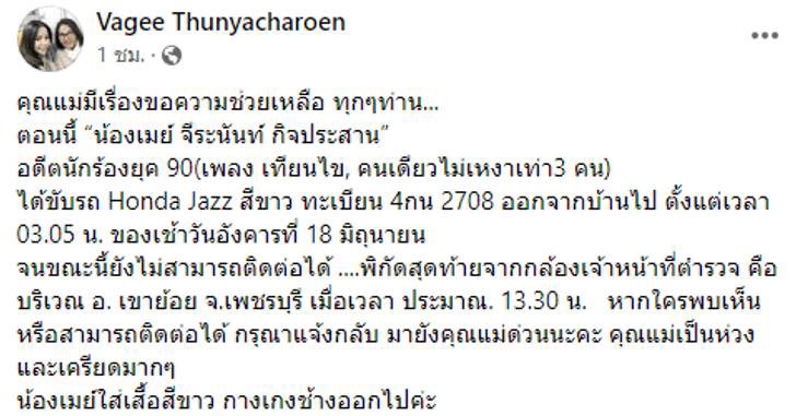 โดยคุณแม่โพสต์ข้อความผ่านเฟซบุ๊คว่า “คุณแม่มีเรื่องขอความช่วยเหลือ ทุกๆท่าน…ตอนนี้ “น้องเมย์ จีระนันท์ กิจประสาน”อดีตนักร้องยุค 90 (เพลง เทียนไข, คนเดียวไม่เหงาเท่า3 คน) ได้ขับรถ Honda Jazz สีขาว ทะเบียน 4กน 2708 ออกจากบ้านไป ตั้งแต่เวลา 03.05 น. ของเช้าวันอังคารที่ 18 มิถุนายน จนขณะนี้ยังไม่สามารถติดต่อได้ พิกัดสุดท้ายจากกล้องเจ้าหน้าที่ตำรวจ คือ บริเวณ อ. เขาย้อย จ.เพชรบุรี เมื่อเวลา ประมาณ. 13.30 น. หากใครพบเห็นหรือสามารถติดต่อได้ กรุณาแจ้งกลับ มายังคุณแม่ด่วนนะคะ คุณแม่เป็นห่วงและเครียดมากๆ น้องเมย์ใส่เสื้อสีขาว กางเกงช้างออกไปค่ะ”