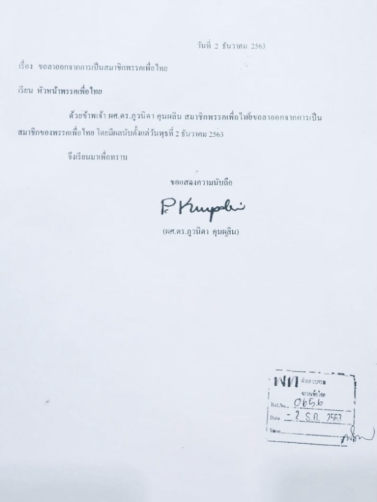 ภายหลังจากที่ คุณหญิงสุดารัตน์ เกยุราพันธ์ อดีตประธานยุทธศาสตร์พรรคเพื่อไทย ได้ยื่นใบลาออกจากพรรคเพื่อไทย สมาชิกพรรคเพื่อไทยกลุ่มคุณหญิงสุดารัตน์ ก็ได้ยื่นใบลาออกกัน อย่างต่อเนื่อง ประกอบไปด้วย 1. นส.ภูวนิดา คุนผลิน อดีต ส.ส.กทม.หลายสมัย 2.นายเอกรัฐ สมันตรัฐ อดีตผู้สมัคร ส.ส.แบบบัญชีรายชื่อ 3. น.ส.ธนัญญกาญจน์ ชลานุเคราะห์ สมาชิกกลุ่มเพื่อไทยพลัส 4. นายวิชเญศ โฮ สมาชิกกลุ่มเพื่อไทยพลัส 5. นายอภิชิต สังขวรรณ สมาชิกกลุ่มเพื่อไทยพลัส โดยมีผลตั้งแต่วันนี้เป็นต้นไป ทั้งนี้ นส.ภูวนิดา ถือเป็นส.ส.ในสังกัดคุณหญิงสุดารัตน์ เกยุราพันธุ์ ซึ่งเคยดำรงตำแหน่งเป็น สมาชิกสภาผู้แทนราษฎร กรุงเทพมหานคร หลายสมัย และเคยดำรงตำแหน่งเป็น อดีตโฆษกกระทรวงคมนาคมและกระทรวงวัฒนธรรม อดีตเลขานุการรัฐมนตรีว่าการกระทรวงการต่างประเทศ อดีตเลขานุการรัฐมนตรีว่าการกระทรวงการคลัง