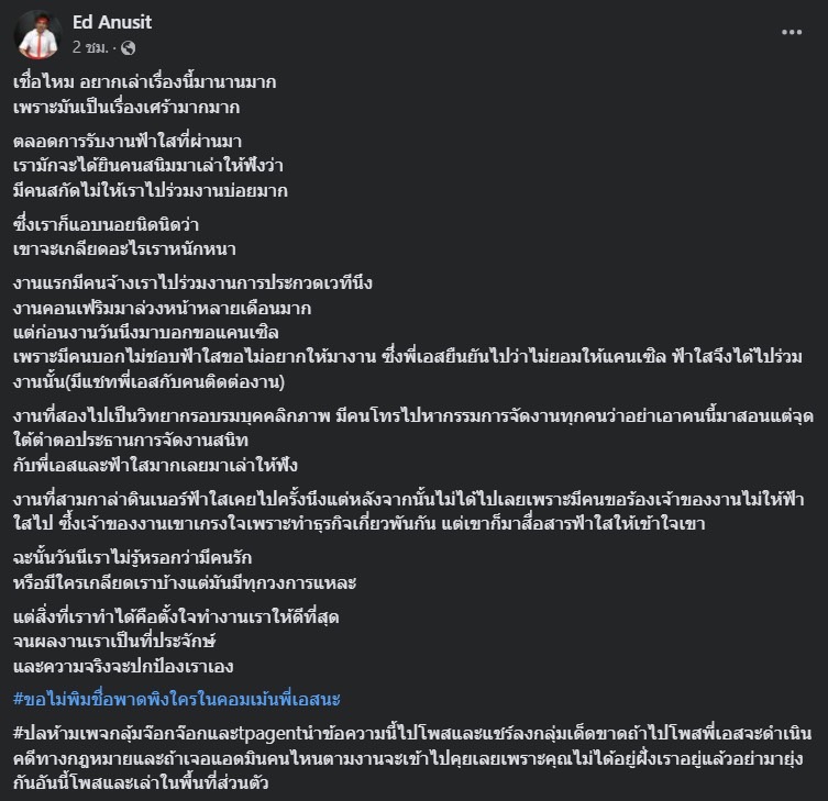 โดย “เอส” ได้โพสต์ข้อความว่า “เชื่อไหม อยากเล่าเรื่องนี้มานานมาก เพราะมันเป็นเรื่องเศร้ามากมาก ตลอดการรับงานฟ้าใสที่ผ่านมา เรามักจะได้ยินคนสนิทมาเล่าให้ฟังว่า มีคนสกัดไม่ให้เราไปร่วมงานบ่อยมาก ซึ่งเราก็แอบนอยนิดนิดว่า เขาจะเกลียดอะไรเราหนักหนา