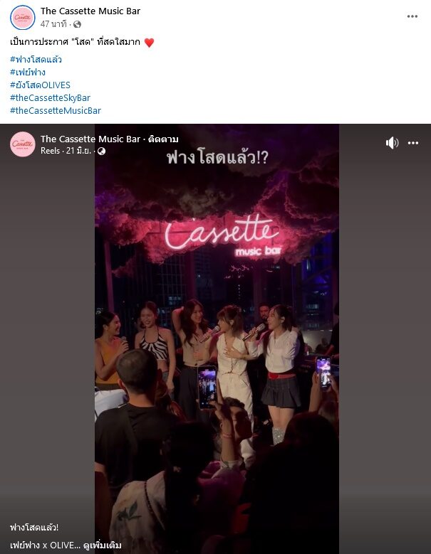 ล่าสุดเรียกว่าทำเอาชาวเอ๊ะมันยังไงกันนะเมื่อ The Cassette Music Bar ได้โพสต์ภาพพร้อมแคปชั่นว่า “เป็นการประกาศ “โสด” ที่สดใสมาก #ฟางโสดแล้ว #เฟย์ฟาง #ยังโสดOLIVES #theCassetteSkyBar #theCassetteMusicBar”