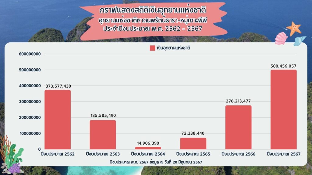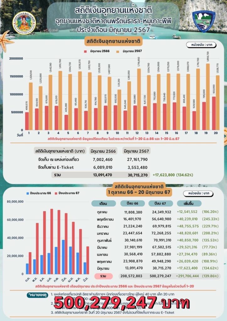 โดยการจัดเก็บเงินของอุทยานแห่งชาติหาดนพรัตน์ธารา-หมู่เกาะพีพี ซึ่งเป็นอุทยานแห่งชาติทางทะเลที่สามารถจัดเก็บเงินรายได้เป็นอันดับ 1 ของประเทศไทย ระหว่างวันที่ 1 ตุลาคม 2566 ถึงปัจจุบัน (วันที่ 20 มิถุนายน 2567) สามารถจัดเก็บเงินได้จำนวนทั้งสิ้น 500,279,247 บาm
