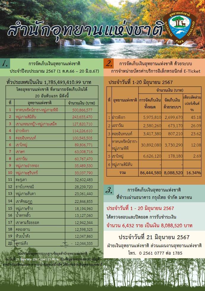 นายชัยวัฒน์ ลิ้มลิขิตอักษร ผู้อำนวยการสำนักอุทยานแห่งชาติ ได้เปิดเผยข้อมูลยอดการจัดเก็บเงินอุทยานแห่งชาติ ตั้งแต่วันที่ 1 ตุลาคม 2566 ถึงปัจจุบัน (20 มิถุนายน 2567) ปรากฏว่ามียอดการจัดเก็บเงินอุทยานแห่งชาติ เป็นจำนวนเงินทั้งสิ้น 1,785,493,410 บาท ซึ่งเป็นยอดสถิติการจัดเก็บเงินอุทยานแห่งชาติ ที่สามารถจัดเก็บเงินจนแซงหน้ายอดการจัดเก็บเงินอุทยานแห่งชาติ ทั้งปีของปี พ.ศ 2566 ไปแล้ว โดยในปีพ.ศ 2566 จัดเก็บเงินอุทยานแห่งชาติทั้งปีได้จำนวน 1,467,641,971 บาท