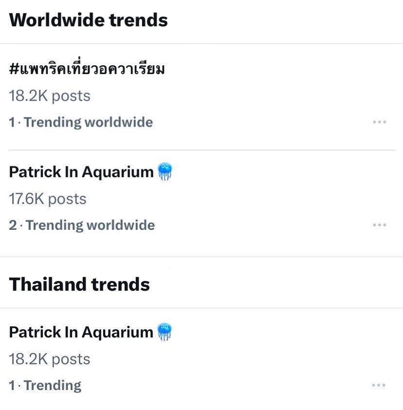 งานนี้เมื่อเหล่าแฟนคลับได้เห็นภาพความหล่อละมุนของ “แพทริค” ที่ลงผ่าน X Patrick ของตัวเอง ก็สร้างเสียงฮือฮา ต่างพากันติดแฮชแท็ก Patrick In Aquarium และ #แพทริคเที่ยวอควาเรียม ติดเทรนด์ X อันดับ 1 ของทั้งเทรนไทย และเทรนโลก พร้อมกับคอมเมนต์รัวๆ ว่าพร้อมใจกันทิ้งงาน กลับคืนร่างเจ้าปลาดาวขอลงน้ำกันแบบฉับพลัน