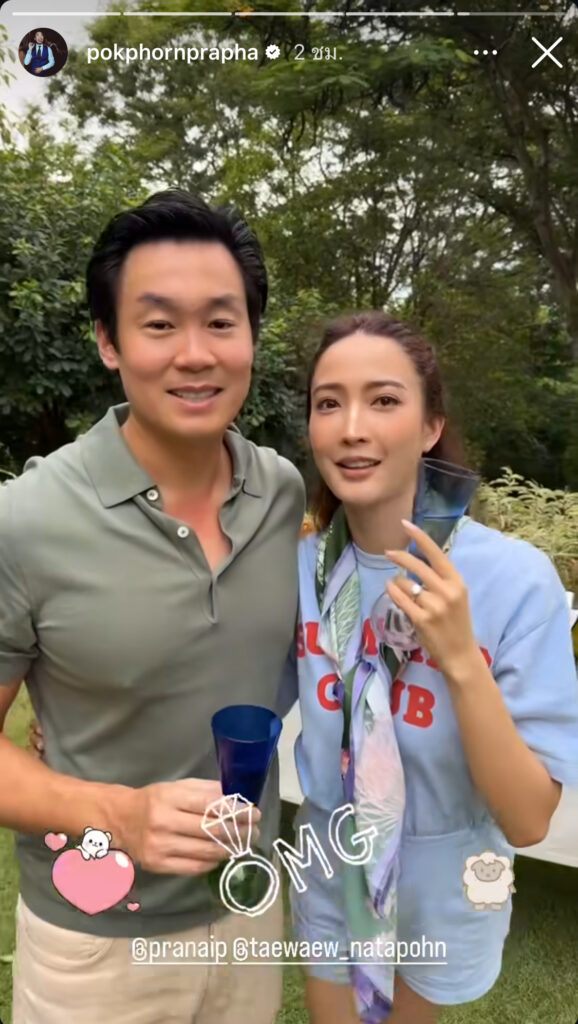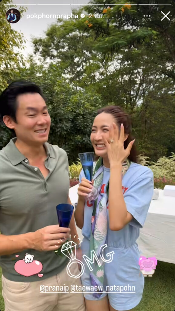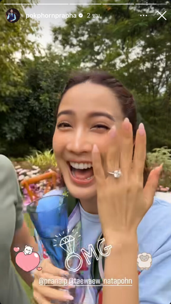 ล่าสุดวันนี้ก็ถึงคิวของนางเอกสาวคนสวย “แต้ว ณฐพร” ที่ถูกแฟนหนุ่ม “ไฮโซณัย ประณัย“ ทำเซอร์ไพรส์สงมแหวนเพชรเม็ดโตขอแต่งงานเป็นที่เรียบร้อย หลังจากคบหาดูใจกันมาหลายปี และทุกคนก็ลุ้นข่าวดีของทั้งคู่มาโดยตลอด