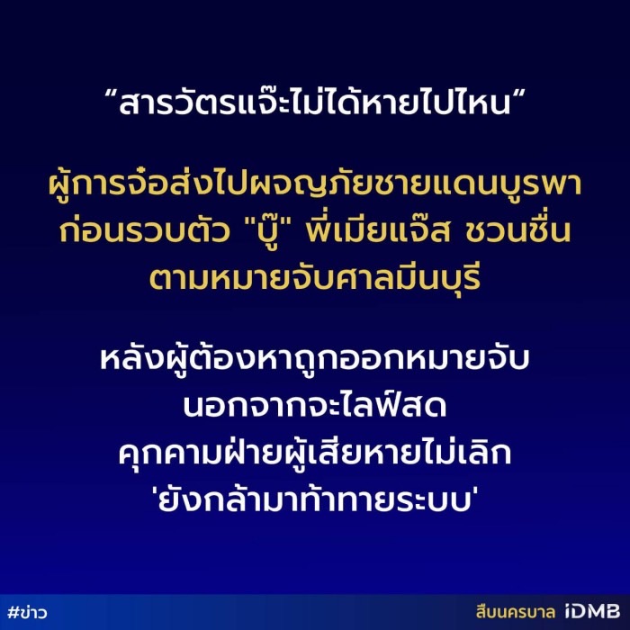 “ตอนนี้โล่งขึ้นเยอะมาก พอตำรวจจับได้ก็ร้องไห้เพราะมันอึดอัดเนื่องจากมีคนพูดร้ายใส่เราและเราพูดกลับไม่ได้ จริงๆ ต้องของคุณสื่อนครบาลมากๆ เขาส่งทีมไปช่วยจับ ด้วยความที่บู๊ เขาท้าท้ายตำรวจไทย สุดท้ายเขาเป็นคนหนีหมายจับแต่เขายังสามารถไลฟ์สดได้ เผยก็4วันจับได้เลย ทางด้านคดีเขาจะจำคุกไหม อันนี้ต้องไปถามตำรวจ เพราะเราไม่รู้เรื่อง แต่สน.มีนบุรีก็จะมีข้อหาข่มข่มทำให้ตกใจกลัวและลักทรัพย์ ส่วนสน.ลาดพร้าวหมิ่นประมาท ยันเอาเรื่องที่สุด เพราะเขาทำความผิด
